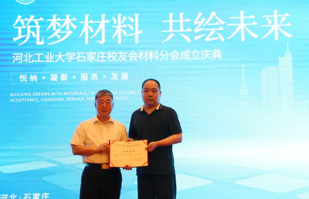 河工大石家莊校友會(huì)韓杏軍會(huì)長(zhǎng)為材料分會(huì)會(huì)長(zhǎng)唐永忠頒發(fā)備案證書(shū)