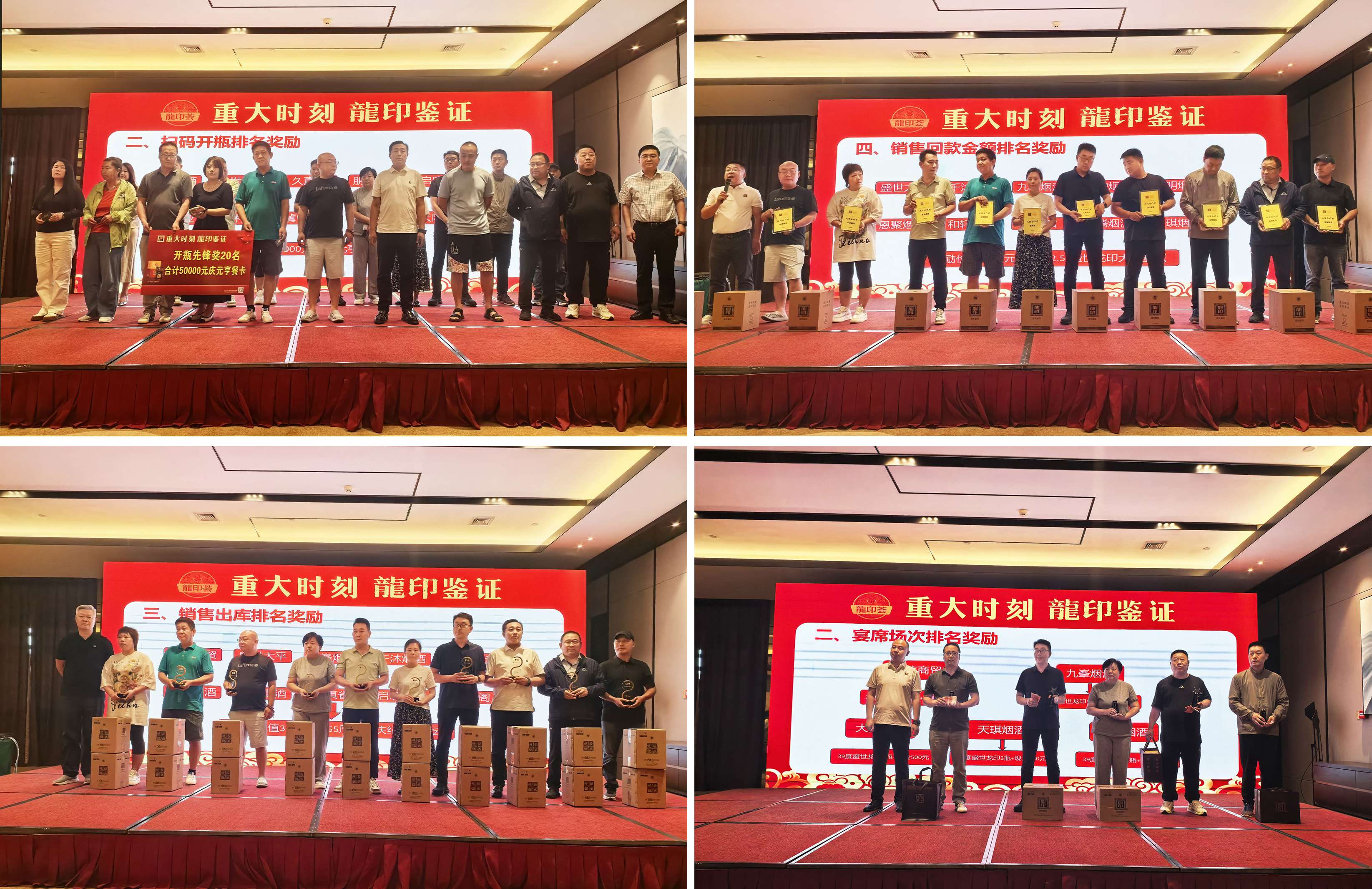 為感謝經(jīng)銷商伙伴長久以來的支持和貢獻,活動現(xiàn)場還設(shè)置了頒發(fā)環(huán)節(jié),石家莊戰(zhàn)區(qū)龍印部銷售總監(jiān)孫坤申、恒潤德酒類品牌管理有限公司董事長潘雁群、石家莊戰(zhàn)區(qū)龍印部區(qū)域經(jīng)理徐立國、恒潤德酒類品牌管理有限公司龍印事業(yè)部經(jīng)理張原分別為開瓶率、履約、回款、宴席做出突出貢獻的終端客戶進行頒獎。